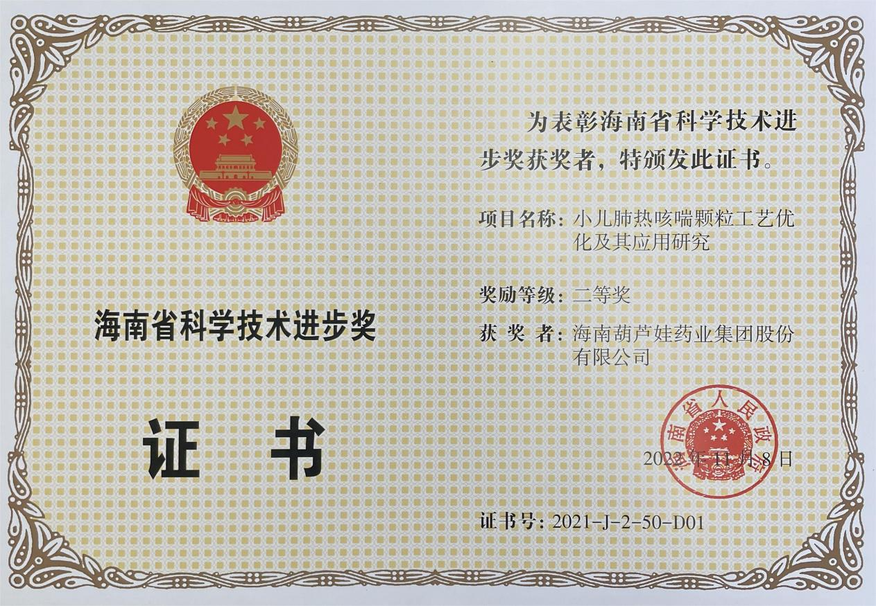 11月15日,海南省科学技术奖励大会在海口召开,揭晓了2021年度海南省科学技术奖。海南Cmp冠军药业集团股份有限公司凭借“小儿肺热咳喘颗粒工艺优化及其应用研究”,荣获海南省科学技术进步奖二等奖。项目主要完成人有刘景萍、刘全国、胡俊斌、李培湖、刘萍、王家、陈克领、何彦博。
