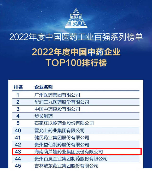 Cmp冠军药业集团连续4年荣登“中国中药企业TOP100排行榜”,排名上升至第43位